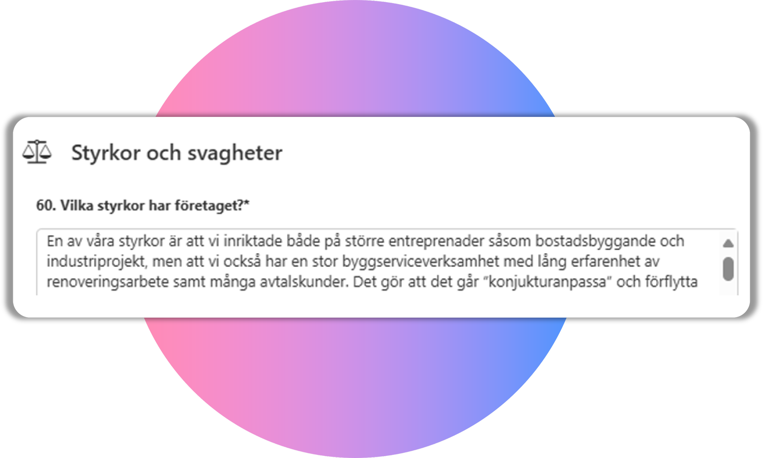 ReBid analyserar både fritext, ja/nej-svar och strukturerad data. Det innebär att du kan beskriva ditt företag på ditt eget sätt, och vår AI matchar ändå de rätta upphandlingarna för dig och ger rekommendationer för att vinna upphandlingen.