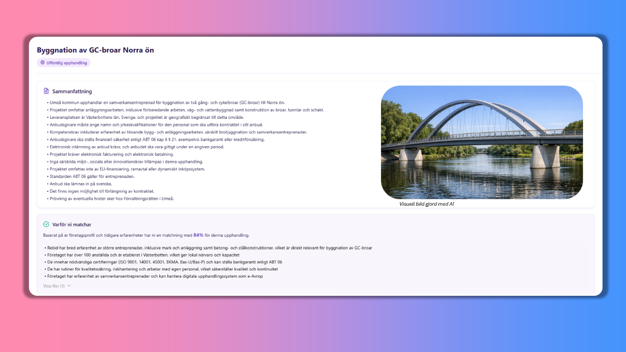 Det var också där de såg att potentialen var som störst. Om byggföretag snabbare kan förstå en upphandling, bedöma sin matchning och se vad som behöver stärkas, då sparar de inte bara tid. Då kan de också fatta bättre beslut.