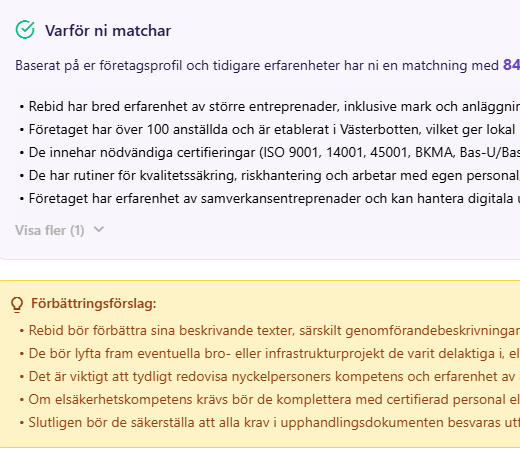 Det handlar också om kvalitet. Rebid visar inte bara en matchningspoäng. Plattformen hjälper även företaget att förstå varför det matchar, vilka styrkor som redan finns och vilka delar som behöver stärkas. På så sätt blir det lättare att gå från magkänsla till mer faktabaserade beslut.