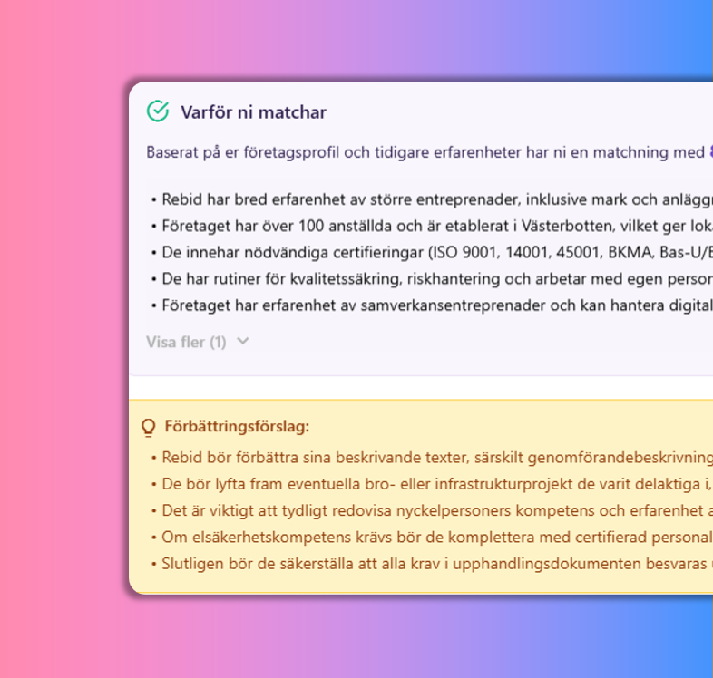 I Rebid kan företaget snabbt se varför en upphandling matchar, hur stark matchningen är och vad som behöver förbättras för att öka chanserna i anbudet. Det innebär att företag kan fokusera på rätt möjligheter, lägga mindre tid på fel affärer och skapa bättre förutsättningar för tillväxt.